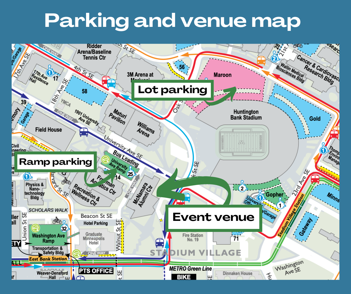 McNamara Alumni Center is located on the East Bank of the University of Minnesota Minneapolis campus, across from Williams Arena and Huntington Bank Stadium and is located off Interstates 35 and 94. The venue is accessible by car, bus, and light rail.